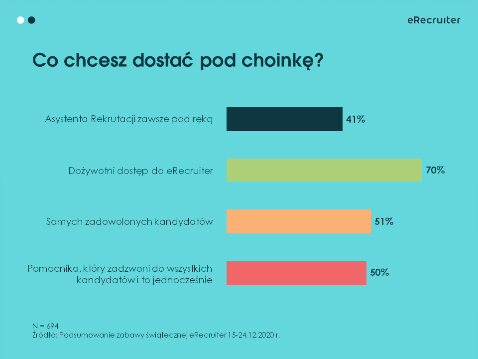 Zdecydowana większość marzy o tym, by eRecruiter był z nimi zawsze i wszędzie (70%). Na kolejnych miejscach listy życzeń znaleźli się sami zadowoleni kandydaci (51%) i niezastąpiony pomocnik, który zadzwoni do wszystkich kandydatów w jednym czasie (50%). Czterech na dziesięciu rekruterów chciałoby pod choinką znaleźć także asystenta rekrutacji, który zawsze będzie gotowy do pomocy!
