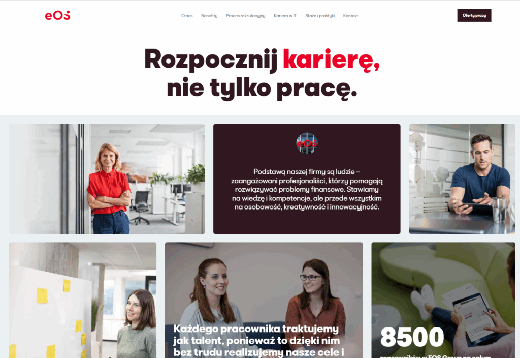 Po rebrandingu EOS Poland potrzebowało nowej strony kariery, zgodnej z aktualnymi standardami i komunikacją marki. Dzięki wsparciu, szybko wdrożono rozwiązanie, które prezentuje kulturę organizacyjną i ścieżki rozwoju, usprawniając rekrutację i poprawiając doświadczenia kandydatów.